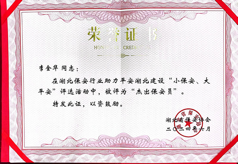 杰出保安員榮譽(yù)證書